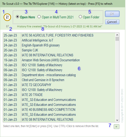 - With this list itself you can apply three functions: a) open different objects, as indicated above in 3, 4 and 5; b) click on an item and see the full Windows path by hovering (shown also at the same location of element 8). Additionally, you can see the time when the Termbase was last opened next to the item selected; a Termbase name may appear repeated to indicate different times even within the same date; c) press and hold the Ctrl key while clicking any item to delete it (no confirmation), as another way to control the length of this list.