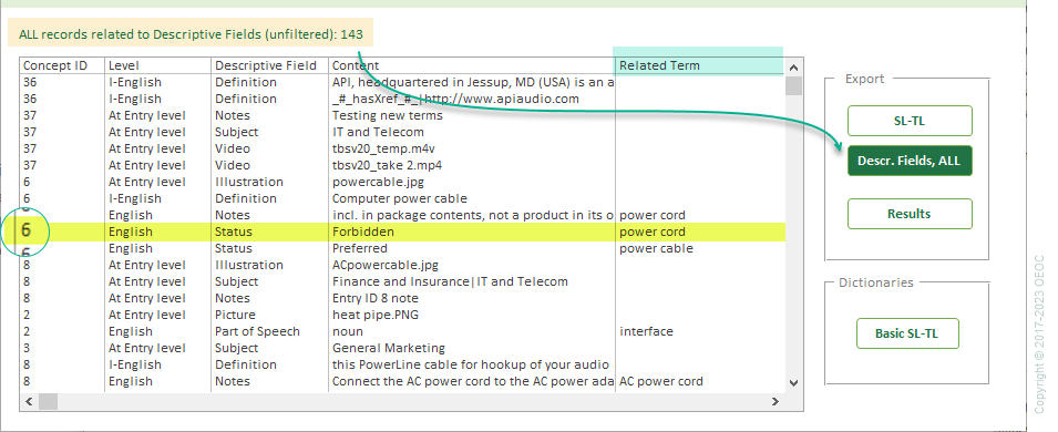 In a few words, when there are Descriptive Fields at the term level, the "Related Term" column will be populated with that specific term or terms.