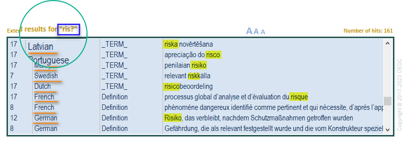 In this example we typed "ris?", using the ? wildcard, with a Termbase comprising 28 languages, searching for "risk", "risico", "risiko", "risque", etc.