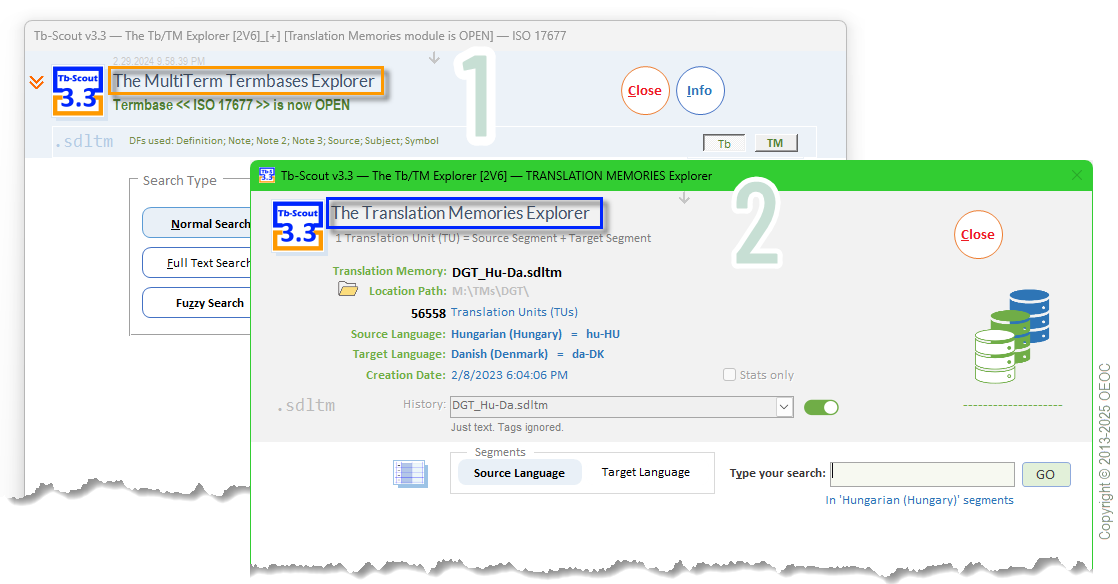 - You can browse and explore Translation Memories (2) simultaneously with Termbases (1), within the same application